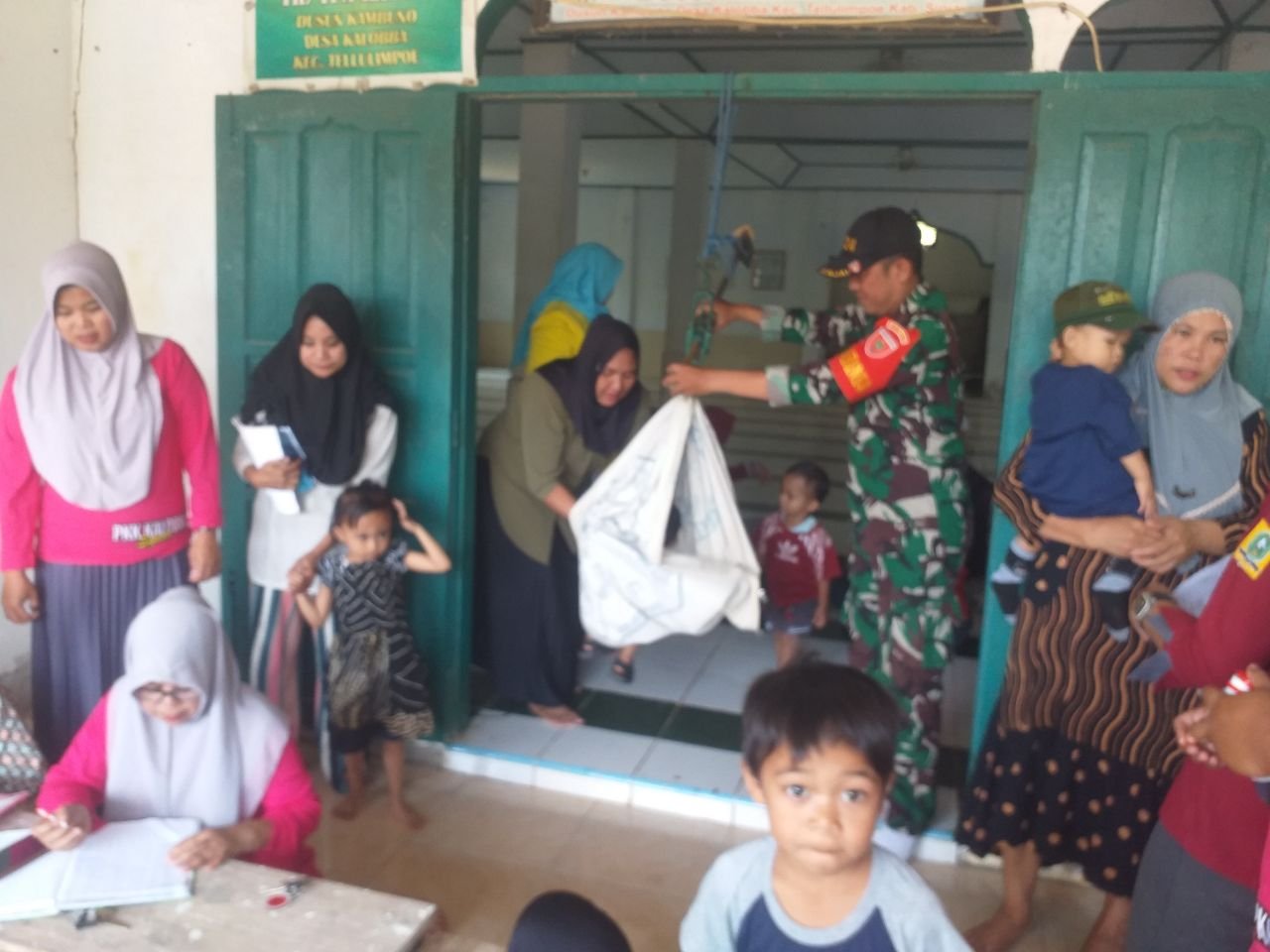 SINJAI, Sul-Sel. Fajarindonesianews.id- Babinsa Desa Kalobba Koramil 05/Sinjai Selatan dan Tellulimpoe Koptu Asis mendampingi petugas kesehatan PKM Lappae melaksanakan pemeriksaan kesehatan anak Balita, peninbangan berat badan dan pemberian Vitamin untuk anak-anak di Dusun Kambuno, Desa Kalobba, Kecamatan Tellulimpoe. Rabu 01/11/2023.