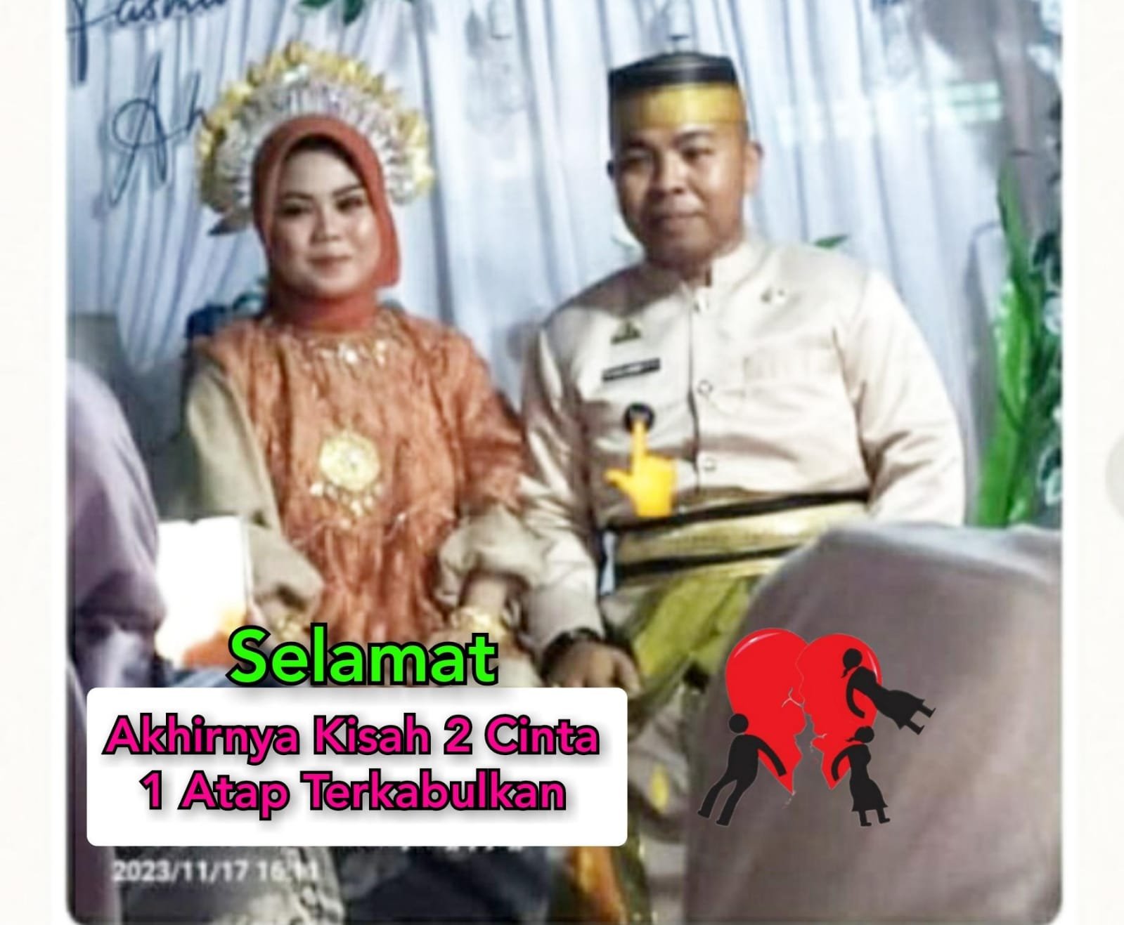 SINJAI, Sul-Sel. Fajarindonesianews.id- Kisah cinta dua sejoli oknum kepala desa pattongko kecamatan tellulimpoe dengan kekasih yang pernah digerebek oleh warga di rumah kosnya di sinjai utara akhirnya berakhir di pelaminan. Dan siap menjalin kisah 1 atap 2 cinta. Sabtu 18/11/2023.