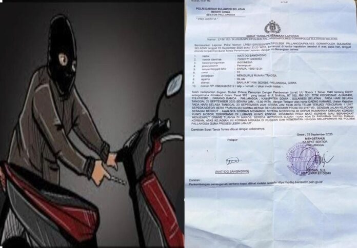 Adapun yang tertuang dalam laporan korban merupakan laporan palsu dengan Nomor:LP/B/112/IX/2025/SPKT/Polsek Pallangga/Polres Gowa/Polda Sulawesi Selatan. Barang bukti yang sudah diamankan di Polsek Pallangga berupa Yamaha Mio M3 Warna merah Nomor Polisi DD 2787 YD.