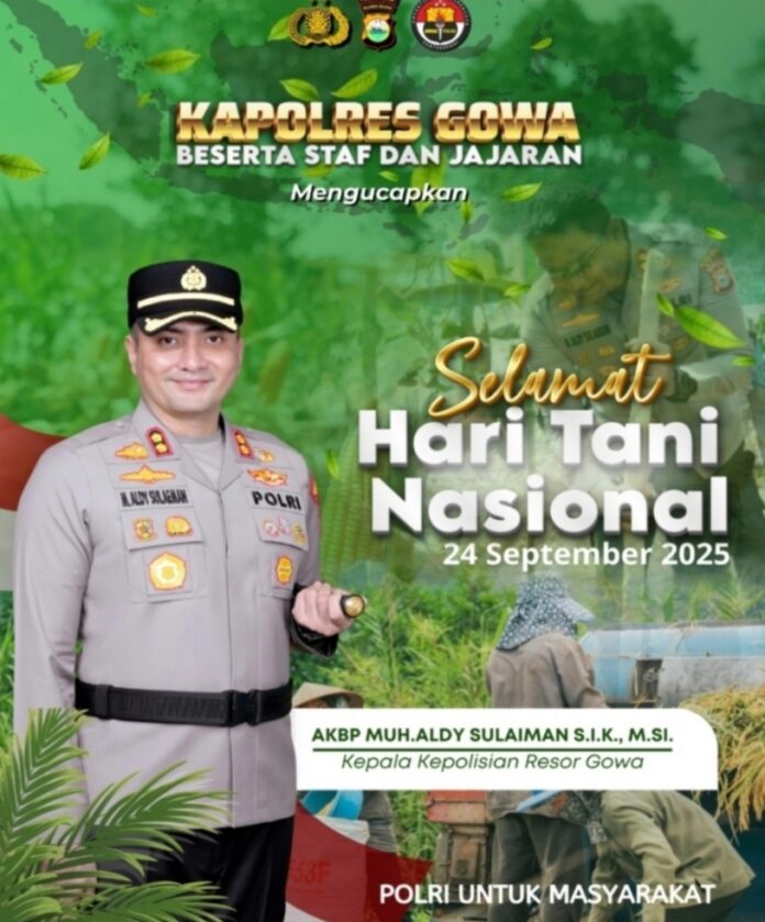 GOWA | FAJARINDONESIANEWS.ID- Kapolres Gowa, AKBP Muh. Aldy Sulaiman, S.I.K., M.Si., bersama staf dan jajaran Polres Gowa, mengucapkan Selamat Hari Tani Nasional yang diperingati setiap 24 September.
