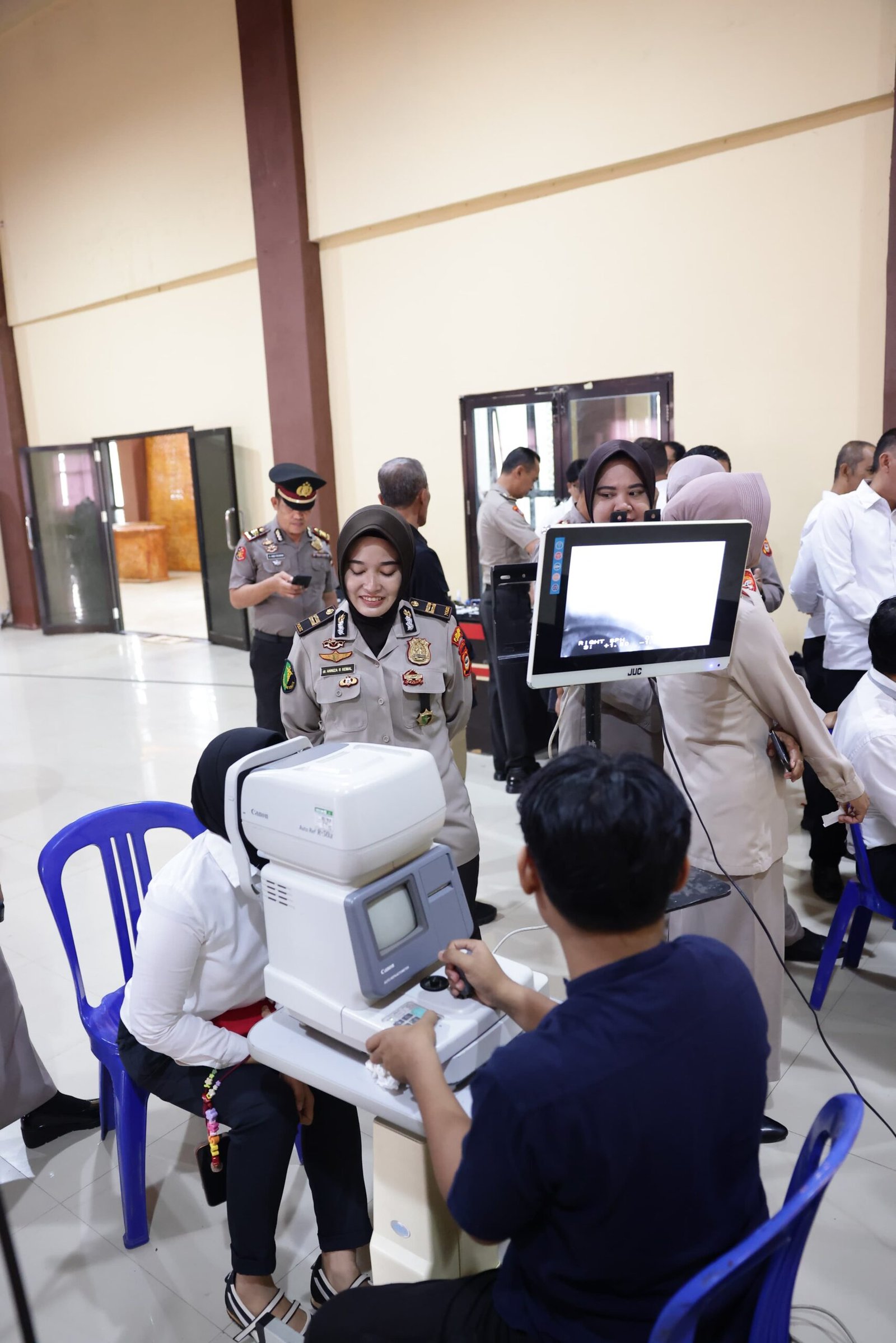 Pemeriksaan meliputi pengecekan ketajaman penglihatan, skrining gangguan mata, serta konsultasi kesehatan mata bagi personel.