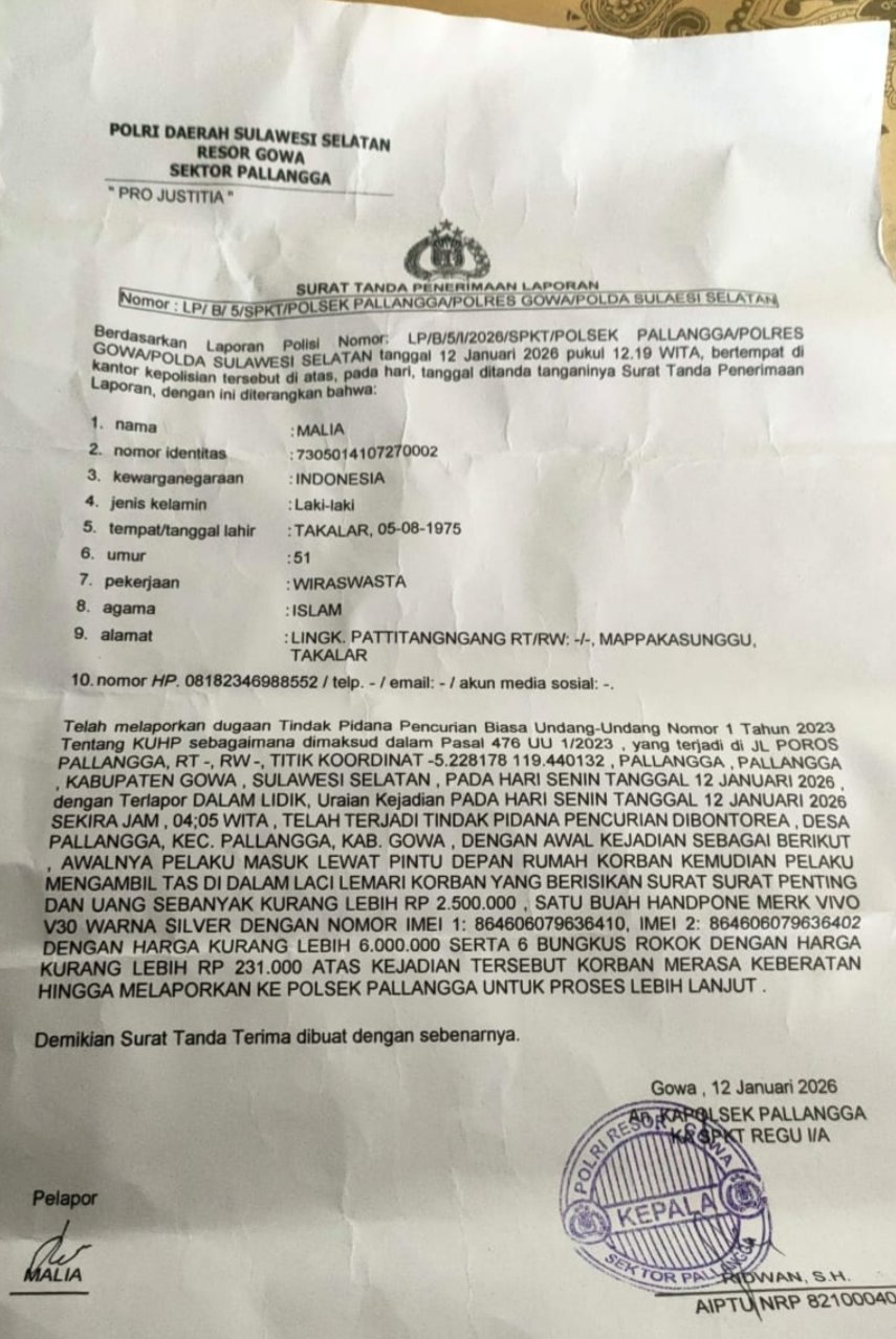 “Maka korban pun mendatangi kepolsek pallangga sembari melaporkan kejadian tersebut dengan nomor LP /B/5/SPKT/Polsek Pallangga/Polres Gowa/Polda Sulawesi Selatan”.