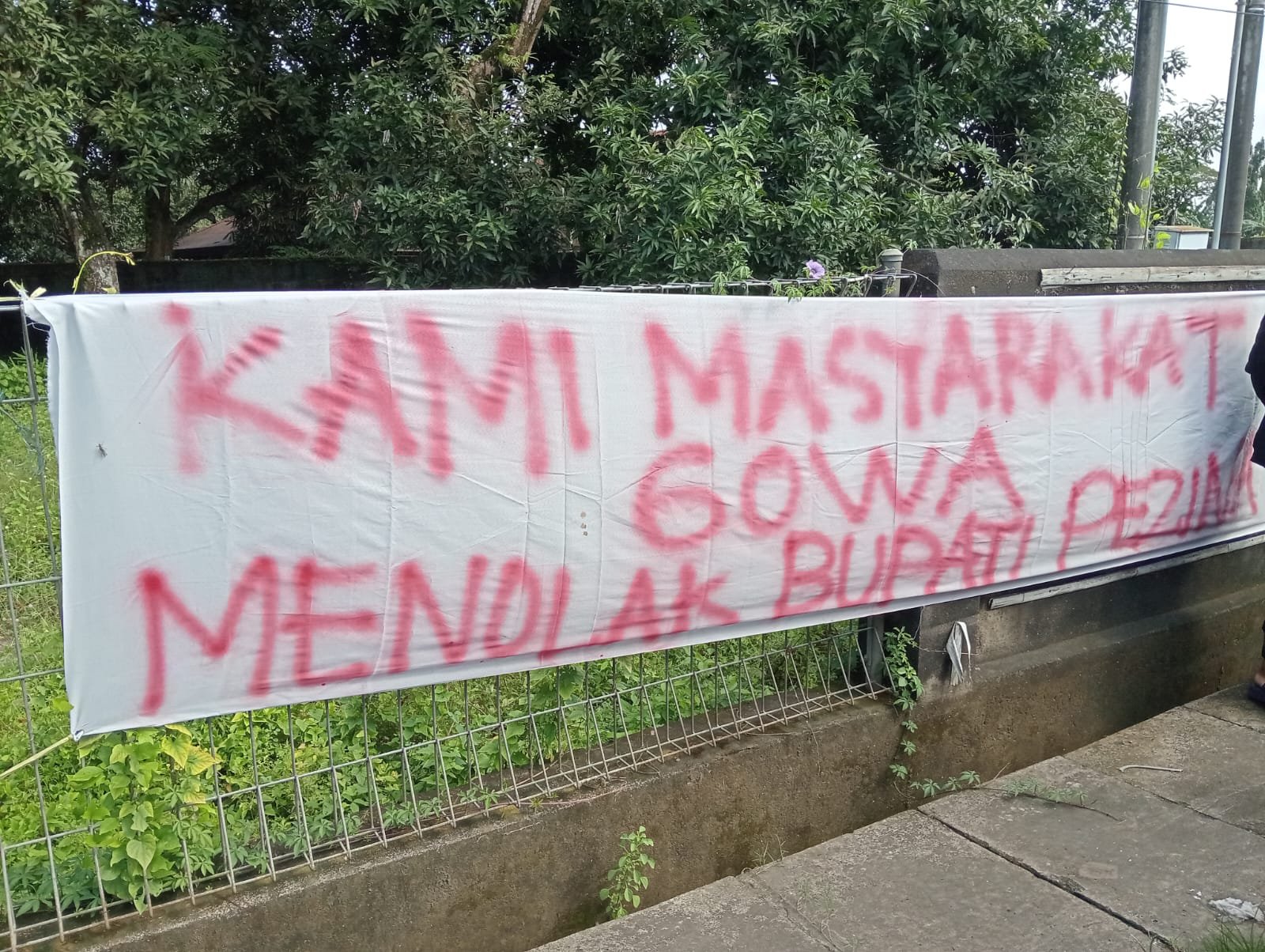 Spanduk yang membentang tersebut bertuliskan kalimat tegas: “Kami Masyarakat Gowa Menolak Bupati Pezina.”