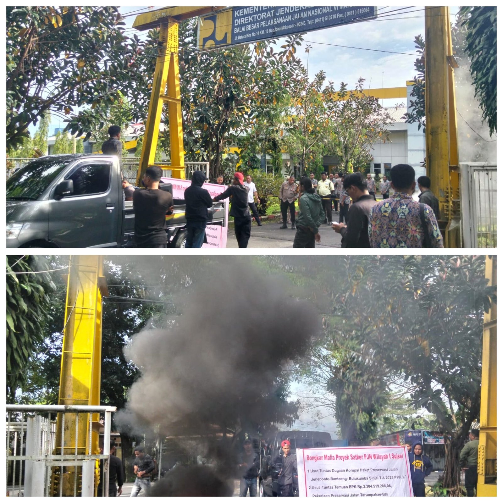 Setibanya di lokasi, mahasiswa langsung melakukan pembakaran ban di depan kantor sebagai bentuk protes keras terhadap dugaan penyimpangan proyek preservasi jalan di sejumlah daerah. Aksi tersebut memicu ketegangan dengan pihak pengamanan internal.