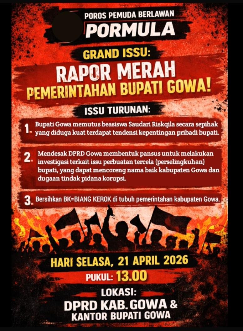 GOWA|FAJARINDONESIANEWS.ID Suasana politik di Kabupaten Gowa kembali memanas. Poros Pemuda Relawan PORMULA siap melancarkan aksi demonstrasi besar-besaran untuk menyuarakan kekecewaan mendalam terhadap kinerja pemerintahan Bupati Gowa. Massa akan turun ke jalan dengan membawa sejumlah tuntutan krusial yang tertuang dalam “Rapor Merah” pemerintahan saat ini.